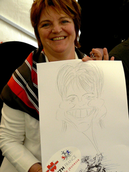 Caricatures faites sur format A3 à la mine de plomb en moins de 3 à 4 mn ; Et caricatures rapides à l’aquarelle (5 à 6 mn) avec une version médiévale.
